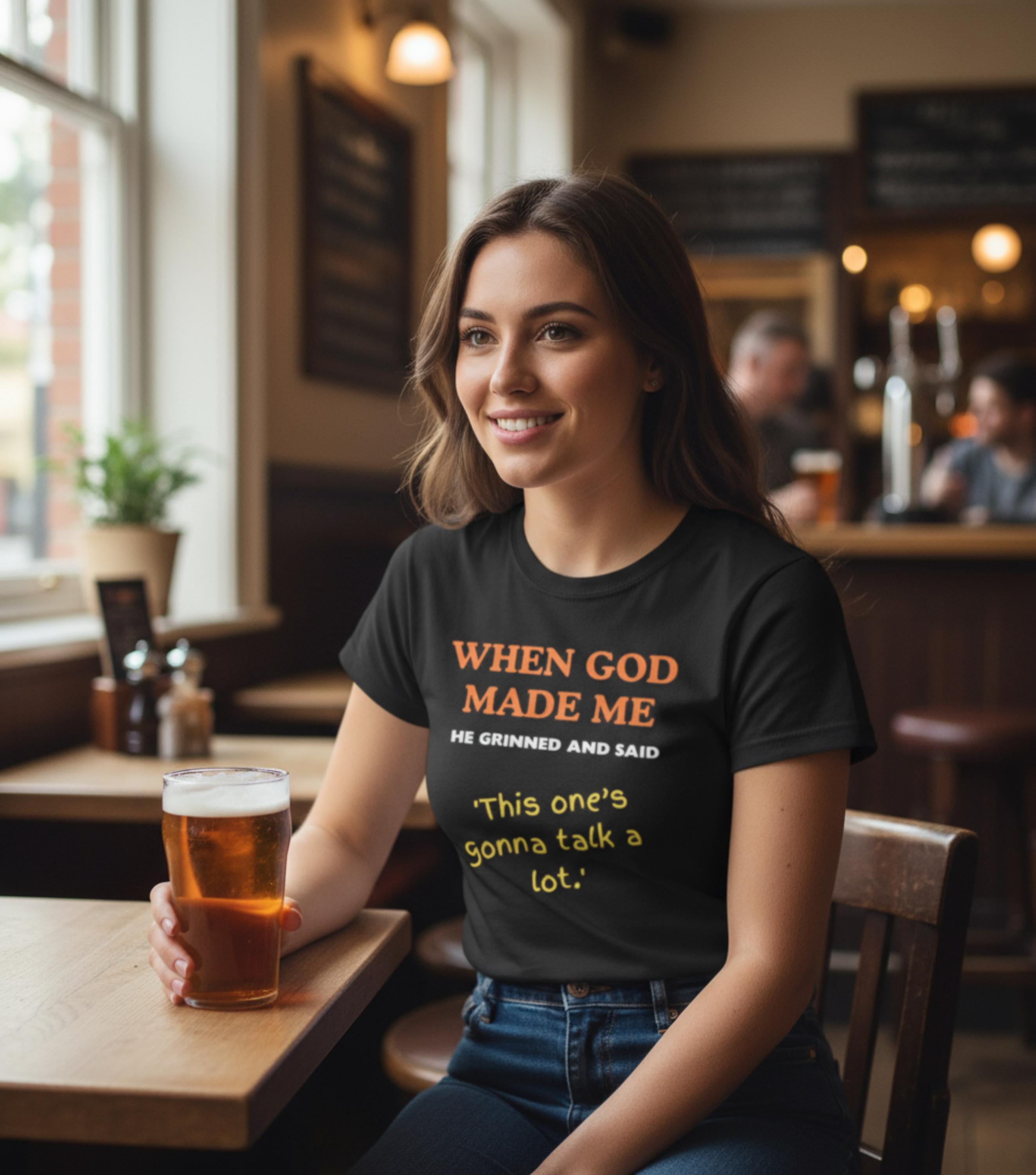 Show off your fun, chatty personality with this hilarious “When God Made Me He Grinned and Said ‘This One’s Gonna Talk a Lot’” t-shirt! Perfect for outgoing, talkative people who love to laugh — and don’t mind admitting it. Great for casual days, hangouts, or as a funny gift for your favorite chatterbox.