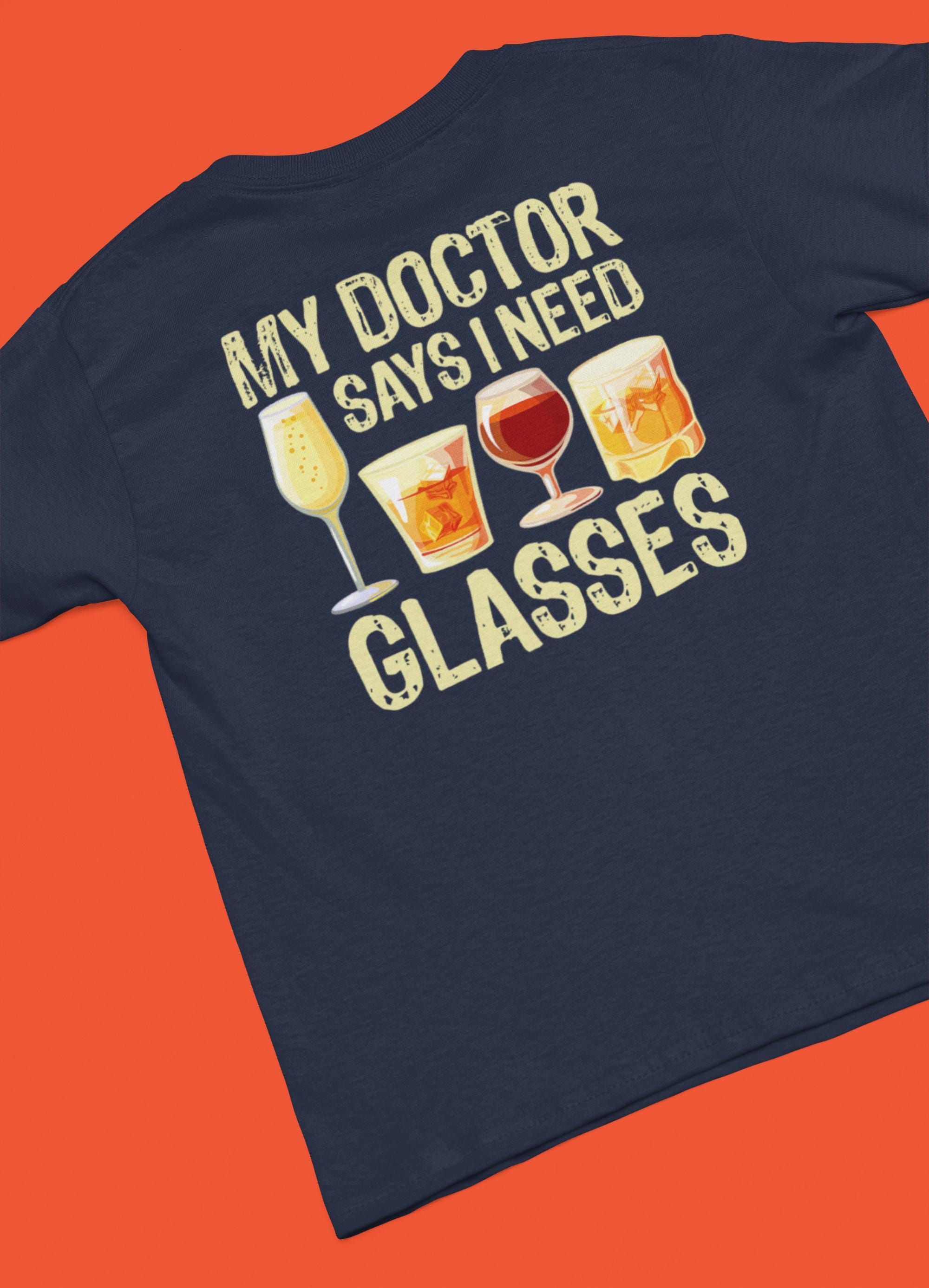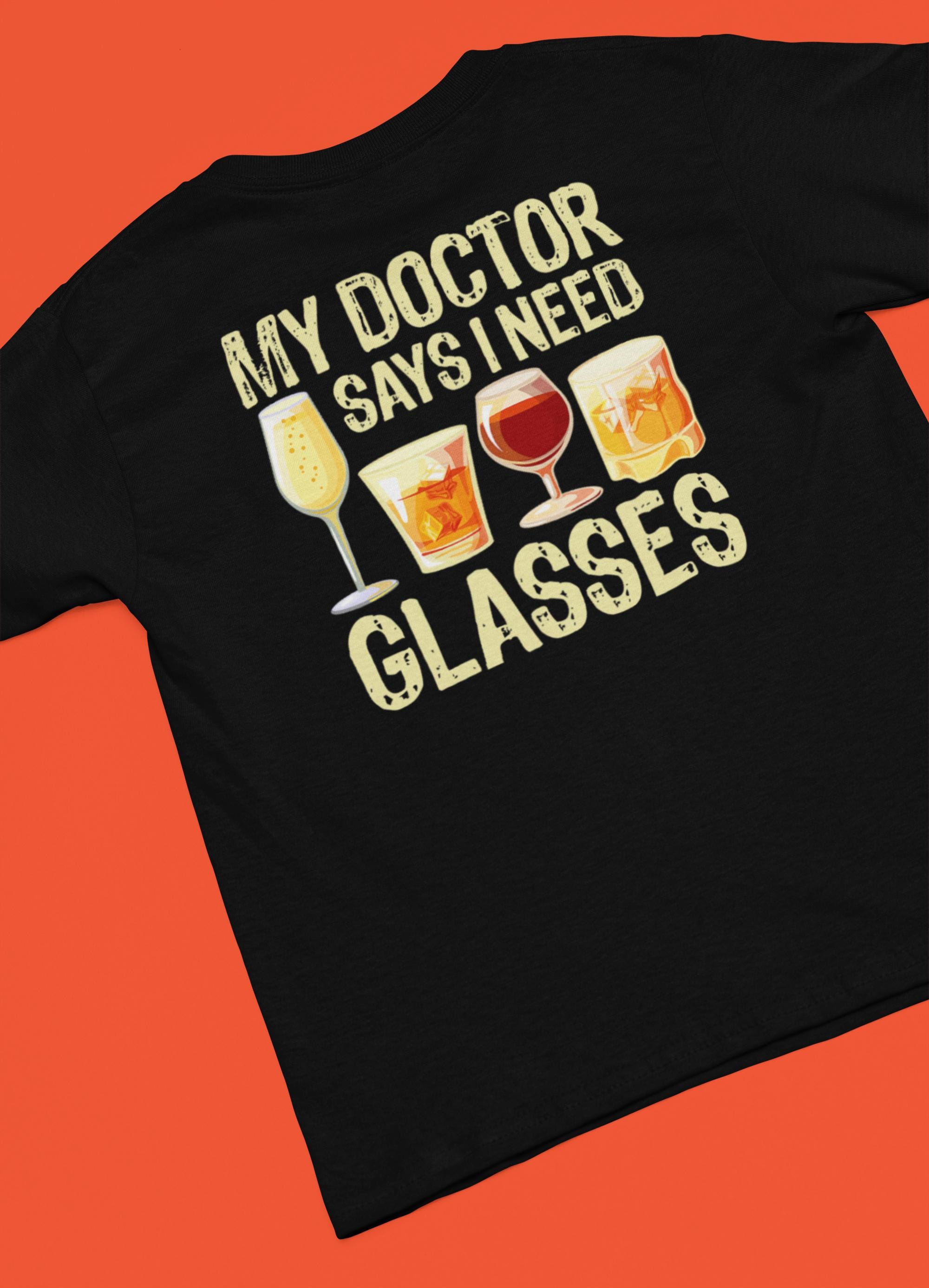 This funny alcohol quote t-shirt features the popular “My Doctor Says I Need Glasses” joke with illustrated drink glasses, making it the perfect tee for parties, pub nights, and anyone who loves a good laugh.