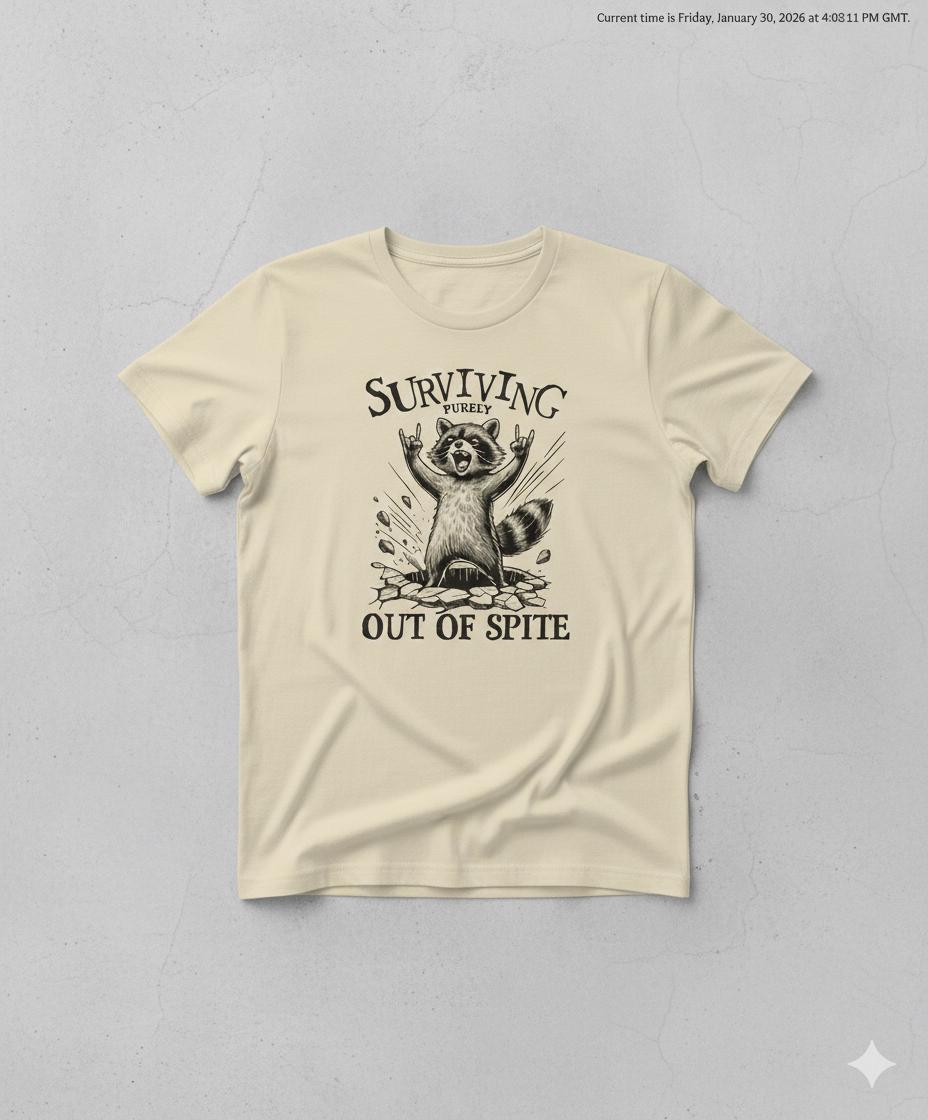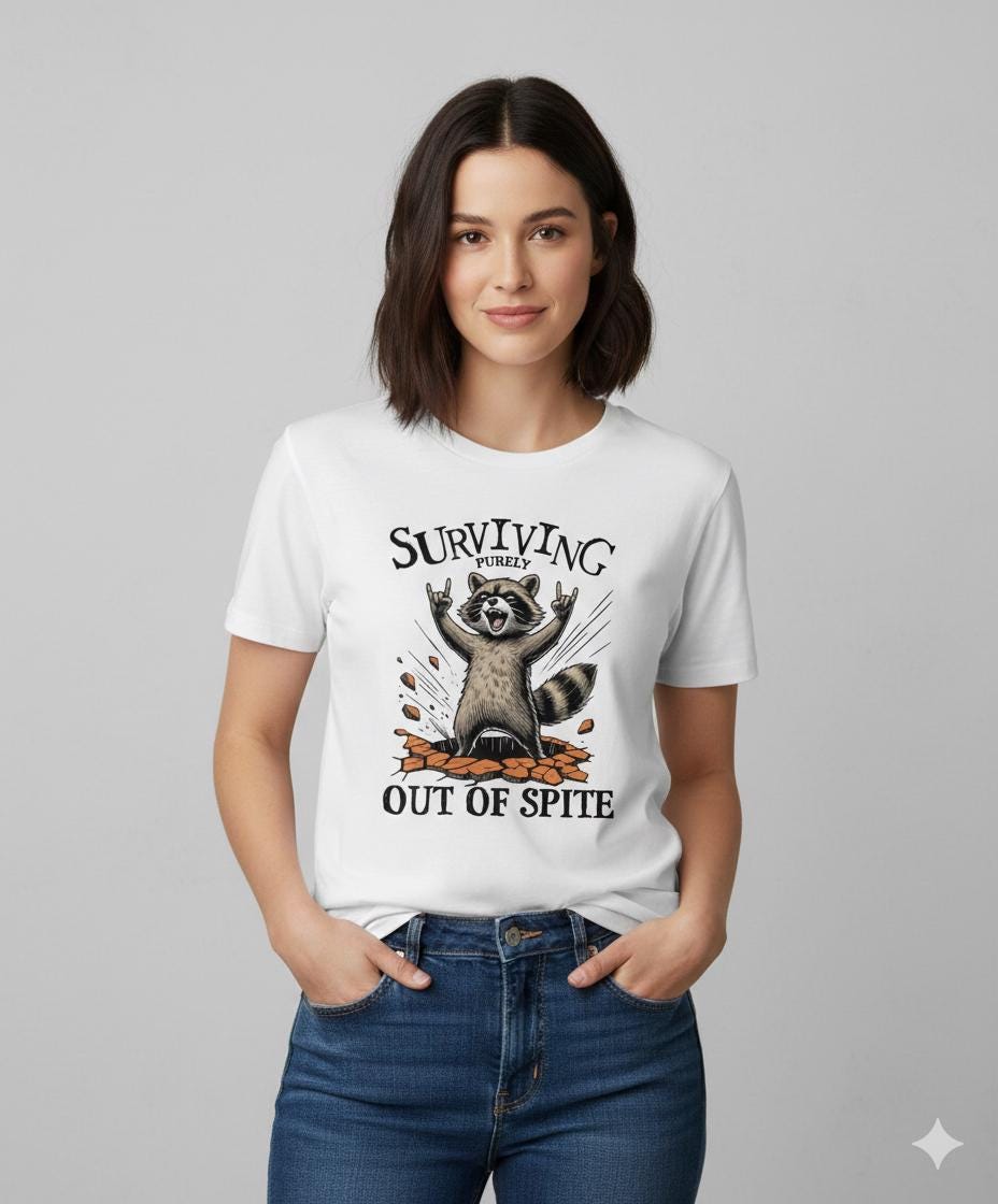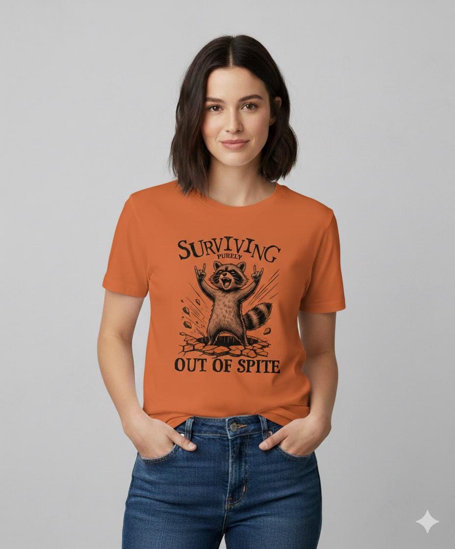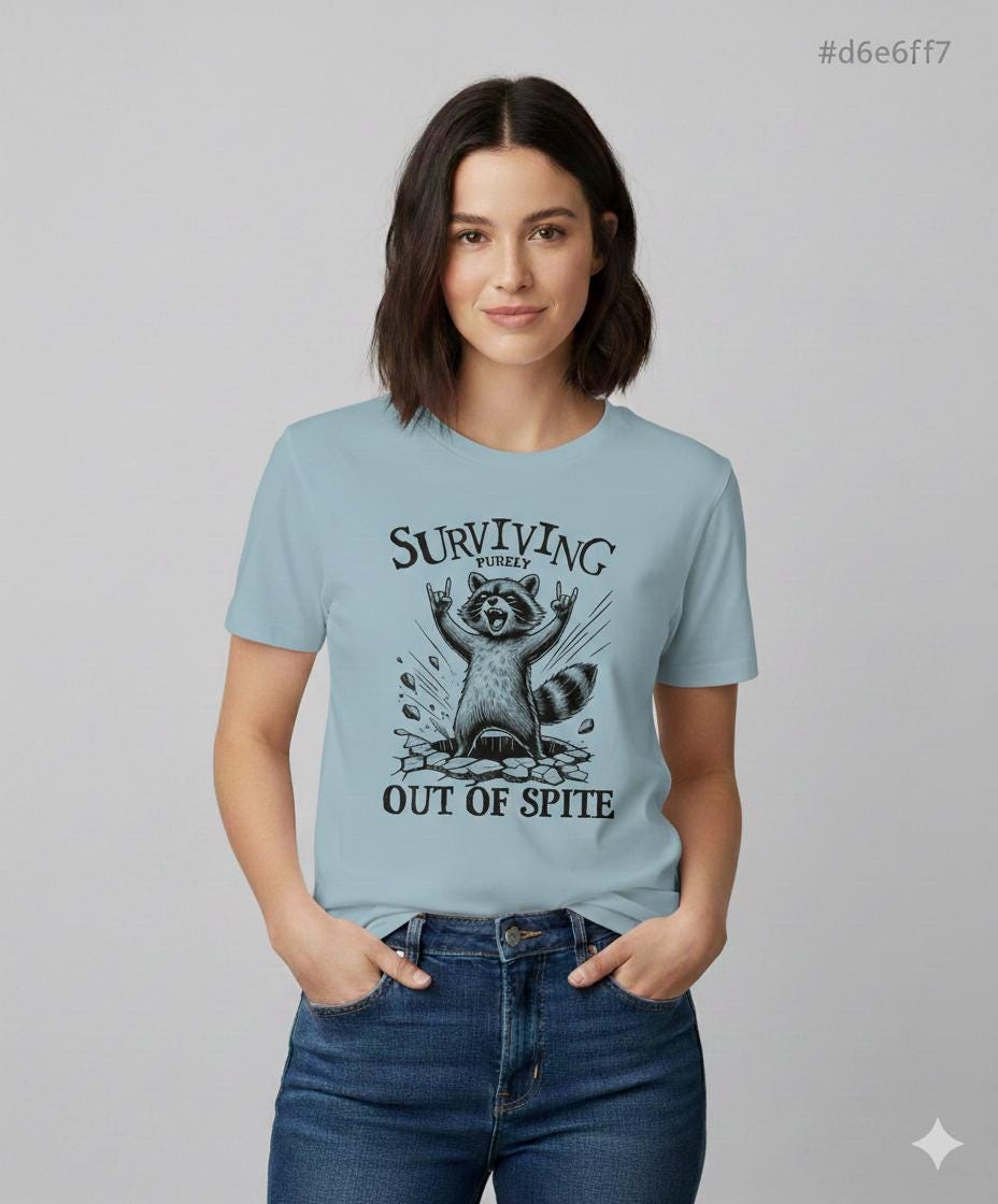 Are you someone who thrives on motivation or survives out of pure spite? Either way, this bold and hilarious raccoon t-shirt is perfect for you. Running on caffeine, stubbornness, and sheer determination? This tee is for you! The design features a defiant raccoon bursting through the ground with hands in the air, capturing that "still standing, somehow" energy that we can all relate to.