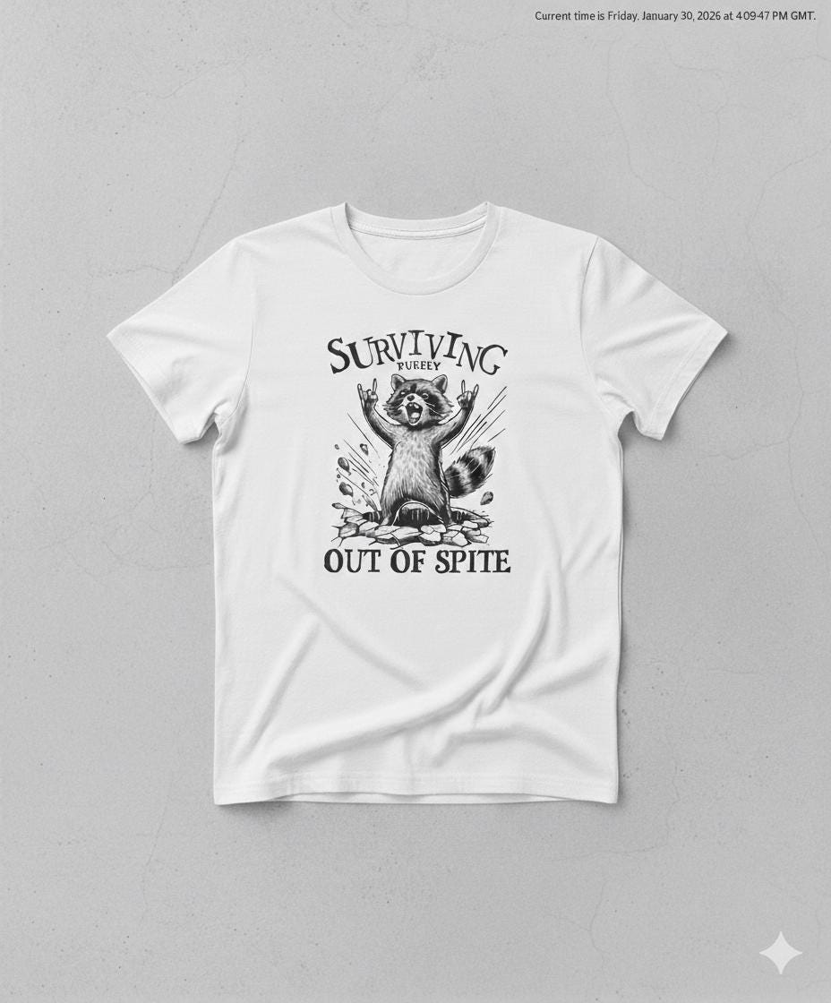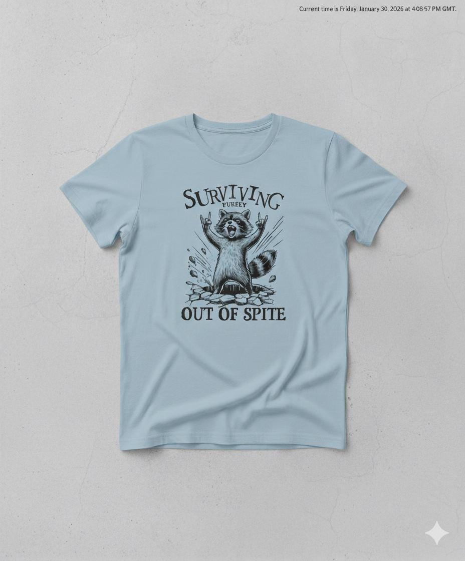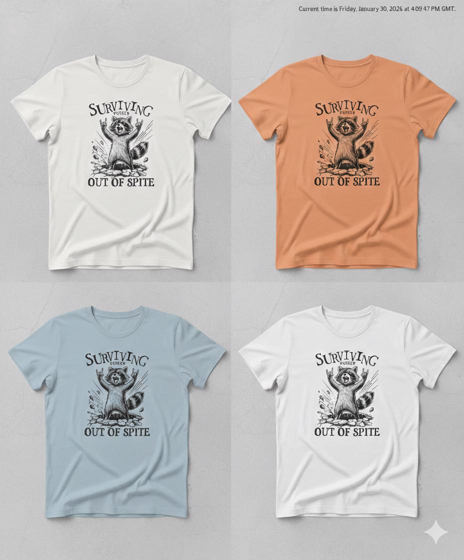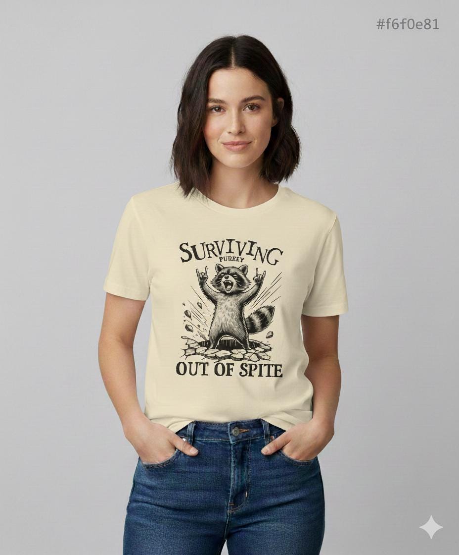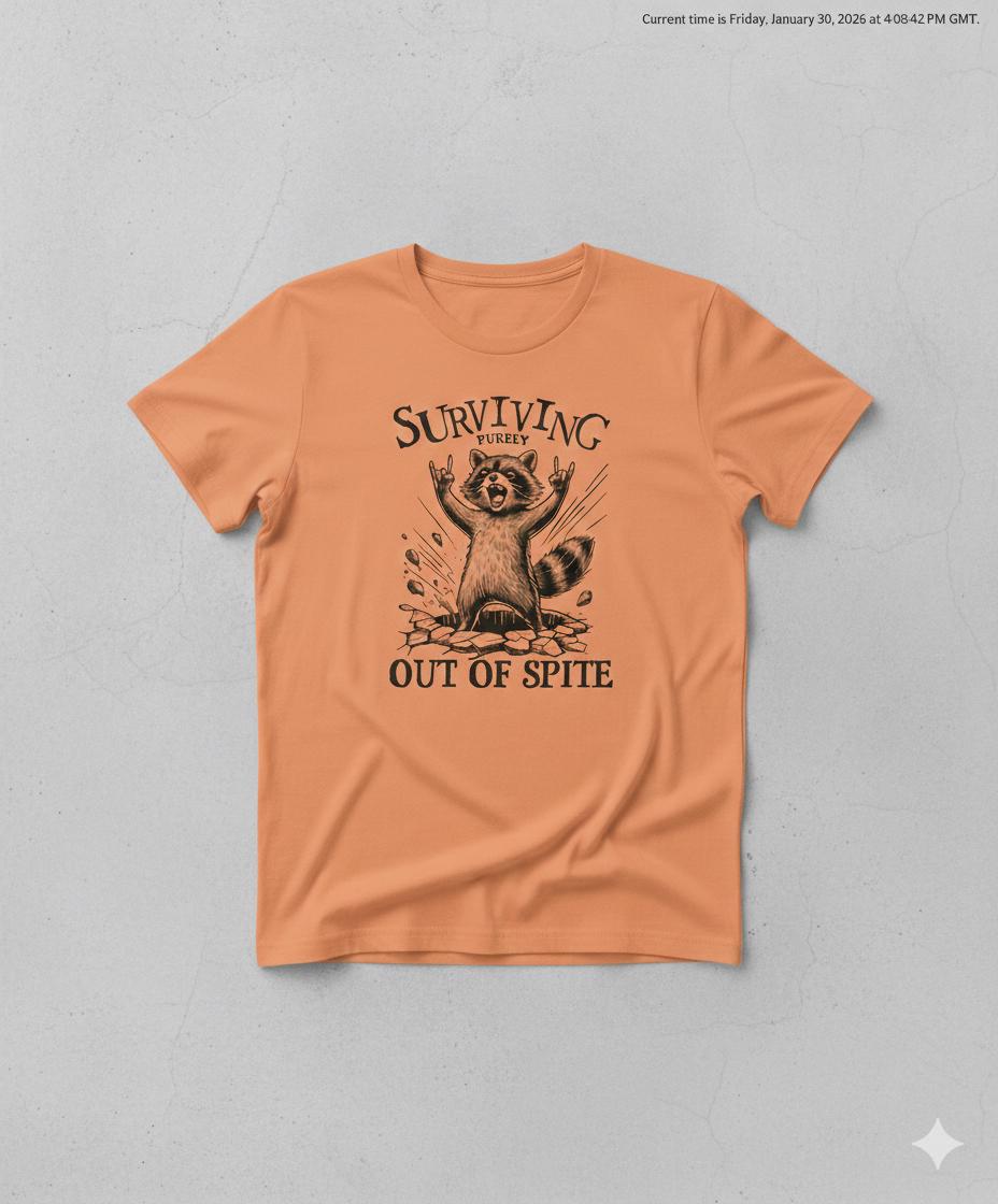 Are you someone who thrives on motivation or survives out of pure spite? Either way, this bold and hilarious raccoon t-shirt is perfect for you. Running on caffeine, stubbornness, and sheer determination? This tee is for you! The design features a defiant raccoon bursting through the ground with hands in the air, capturing that "still standing, somehow" energy that we can all relate to.